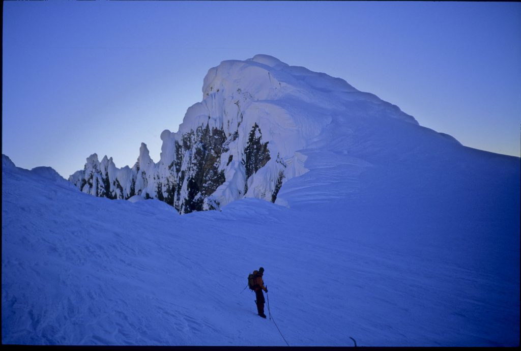 En 4 heures Manu et Didier sont à la rimaye du Hombro Norte, l’express de la nuit remontera la face Nord à droite du sommet par un fin couloir suivi de deux longueurs de mixte. 2 heure du matin, la lune commence à rougir à l’approche de l’horizon, l’express fait un arrêt sur l’épaule du Hombro Norte, il n’a pas de retard, les passagers en profitent pour admirer le paysage … l’arête sommitale s’étire, monte et descend, jusqu’au sommet encore loin sous la croix du sud. Roulé dans son parapente, entre Thomas et Guillaume, François dort au camp 2 …