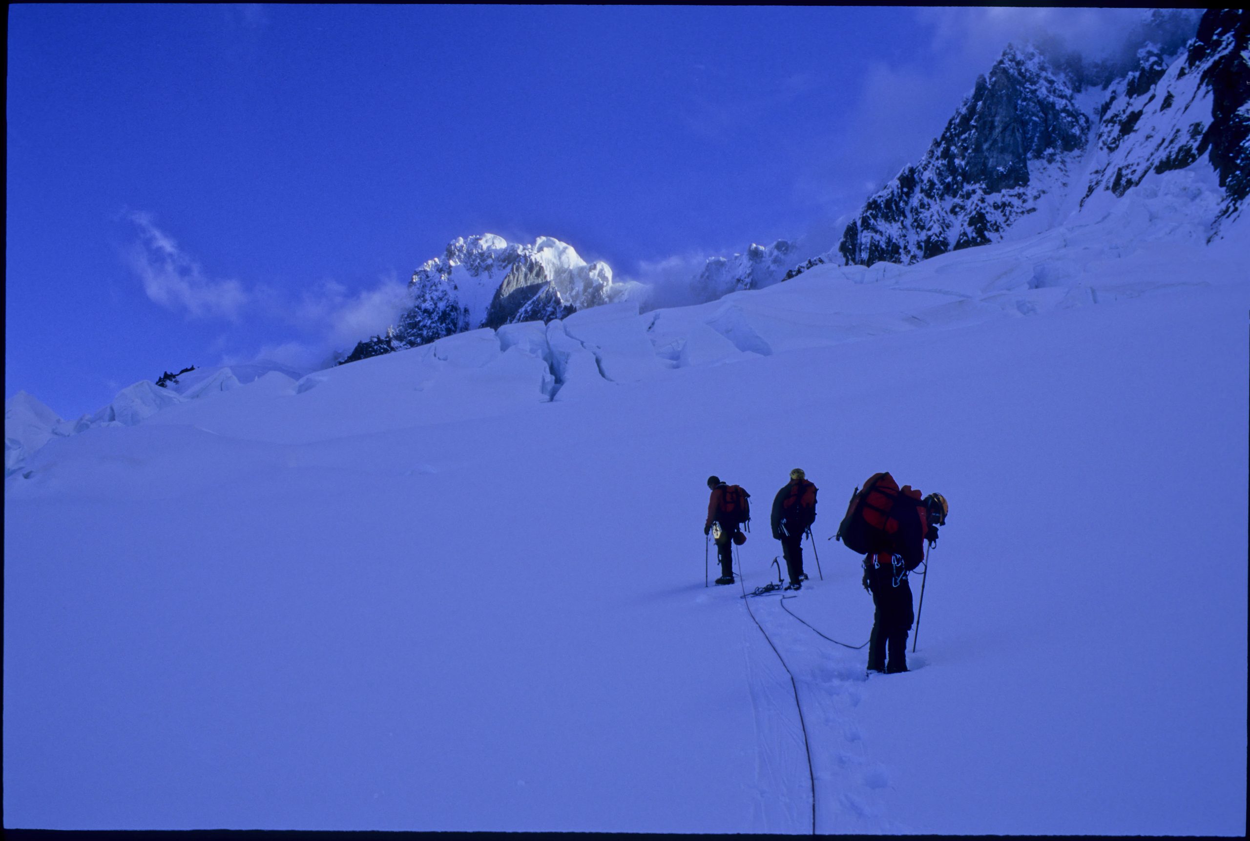 En 4 heures Manu et Didier sont à la rimaye du Hombro Norte, l’express de la nuit remontera la face Nord à droite du sommet par un fin couloir suivi de deux longueurs de mixte. 2 heure du matin, la lune commence à rougir à l’approche de l’horizon, l’express fait un arrêt sur l’épaule du Hombro Norte, il n’a pas de retard, les passagers en profitent pour admirer le paysage … l’arête sommitale s’étire, monte et descend, jusqu’au sommet encore loin sous la croix du sud. Roulé dans son parapente, entre Thomas et Guillaume, François dort au camp 2 …