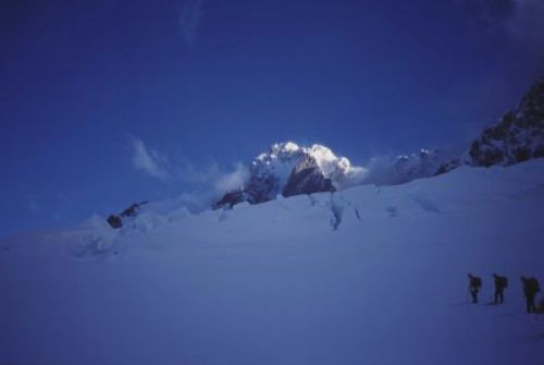L’approche ne fut pas une mince affaire et au lieu des 2 heures envisagées, il a fallu 6 heures en traçant dans 70cms de neige fraîche pour rejoindre le pied du couloir. Après une nuit complète à grimper et la dégradation des conditions météo nous sommes tous rentrés le 27 après-midi au camp de base. 30 heures de gymnastique verticale durant lesquelles Didier s’est particulièrement distingué dans un franchissement de rimaye au pieu à neige et à la pelle.