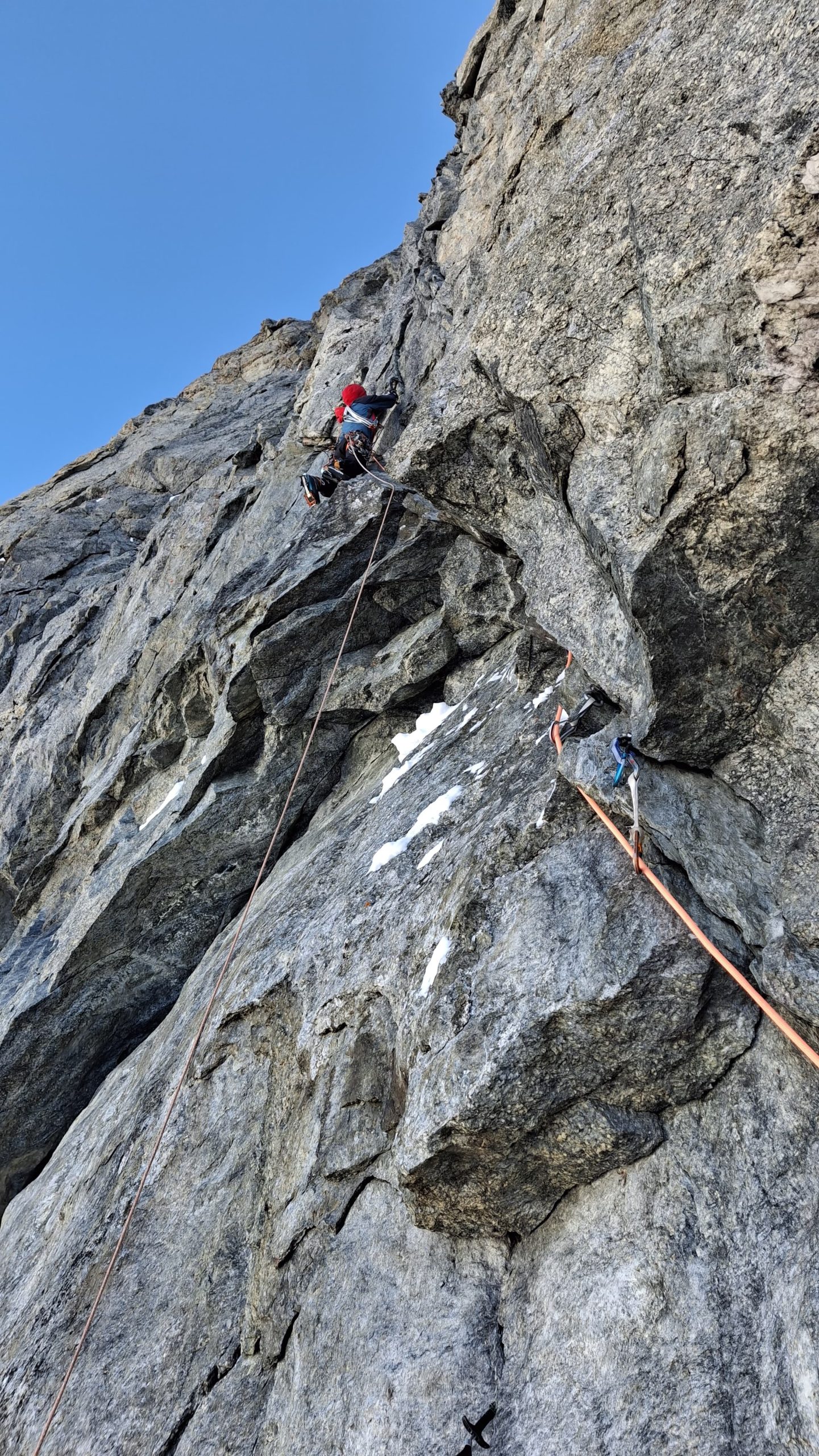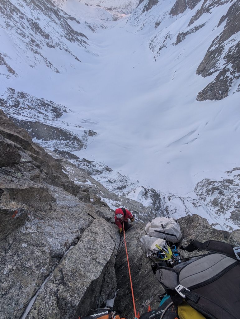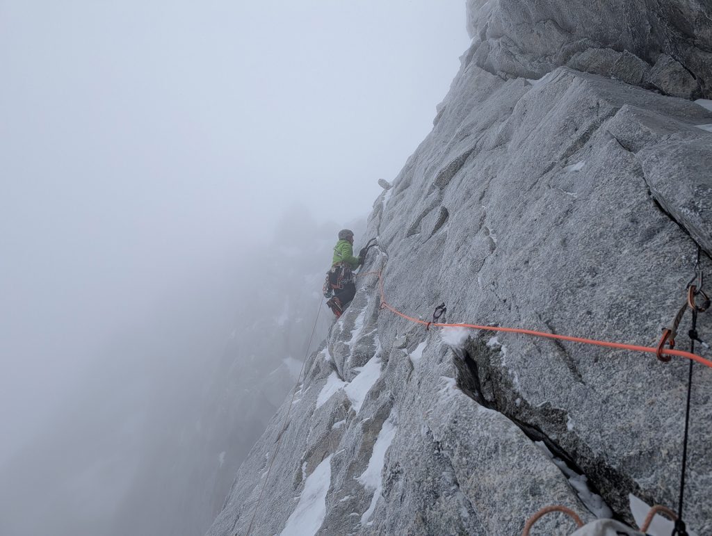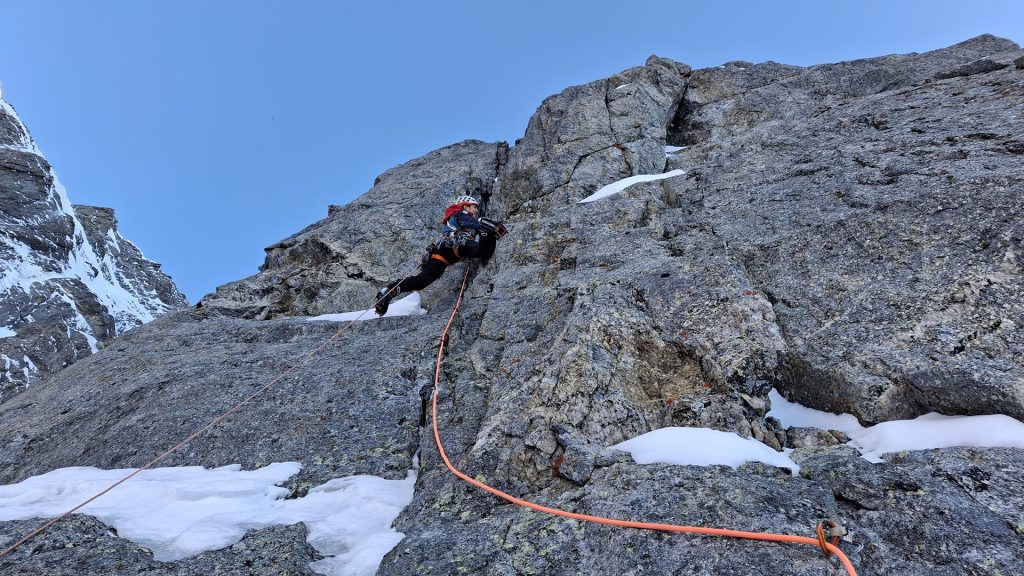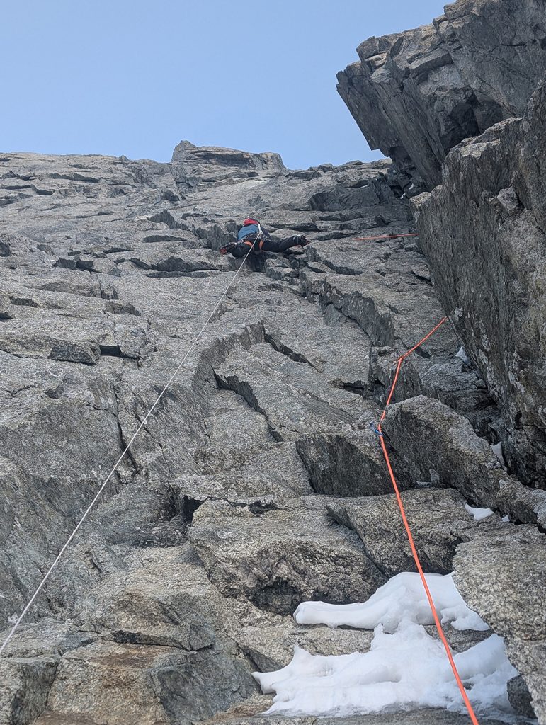 Comme en escalade libre, les mouvements apparaissent peu à peu. Les placements s’enchaînent. Ça passe. Mieux : ça fonctionne. Une euphorie brève, vite rattrapée par la réalité. Les dix derniers mètres sont engagés, protégés uniquement par des Bird Beak douteux, plantés dans un rocher qui ne pardonnera pas l’erreur.
