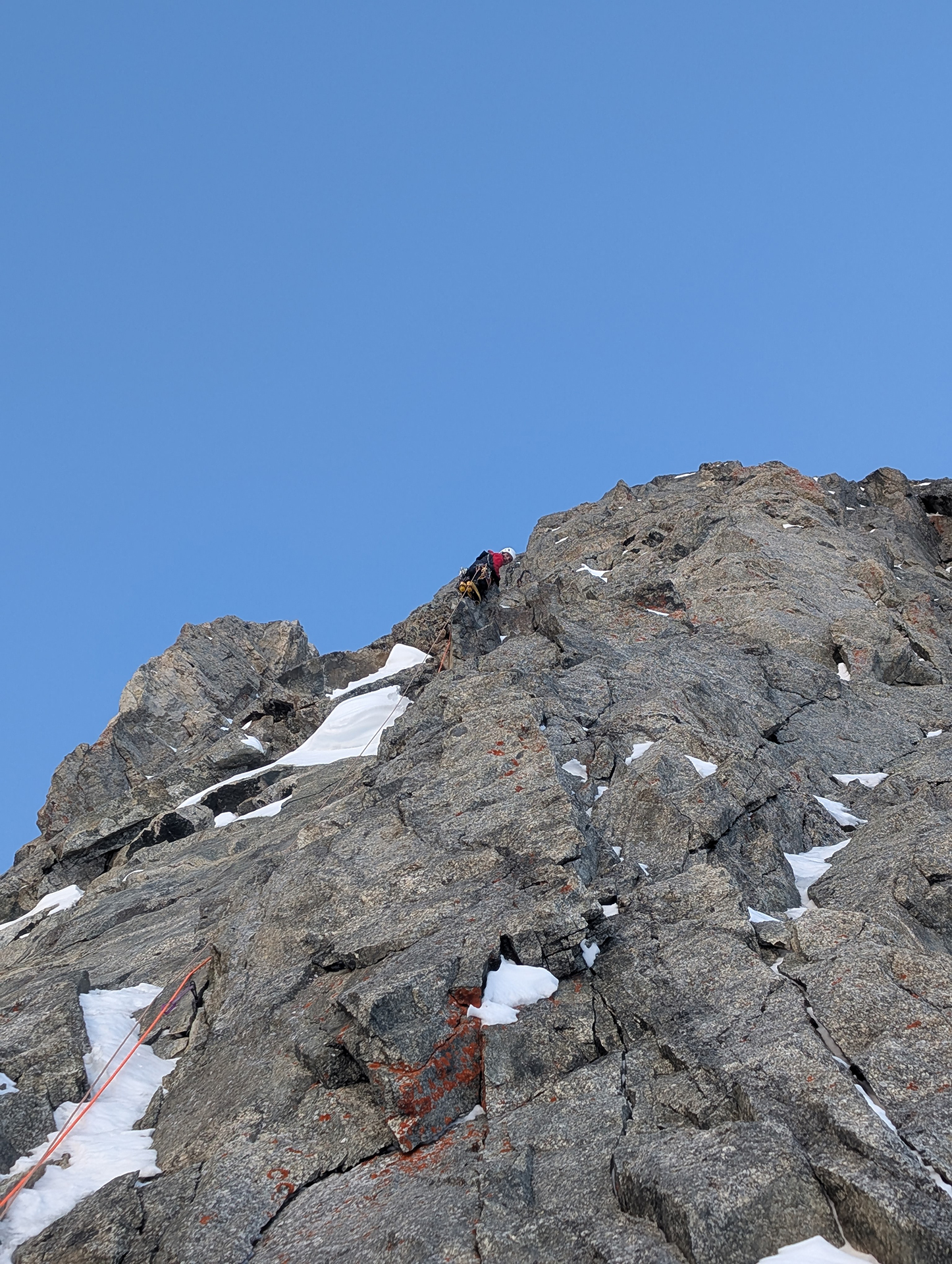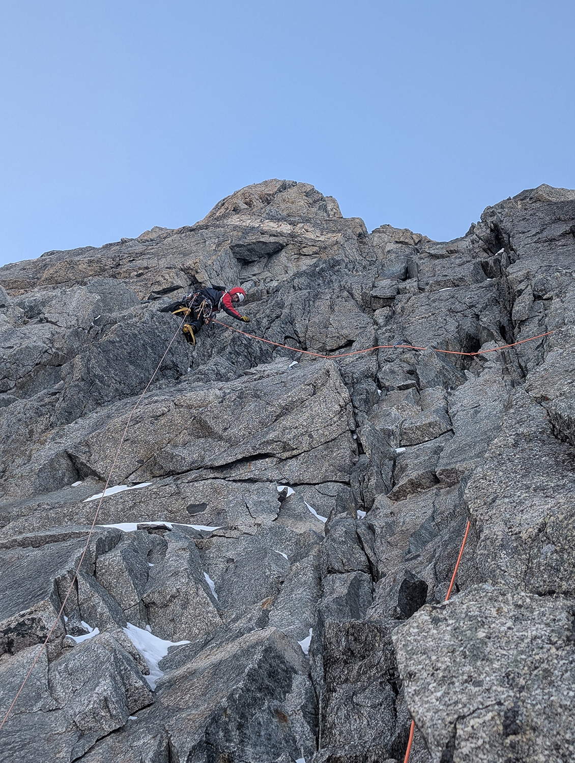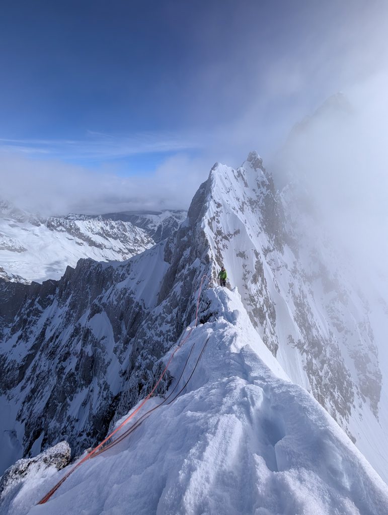 Comme en escalade libre, les mouvements apparaissent peu à peu. Les placements s’enchaînent. Ça passe. Mieux : ça fonctionne. Une euphorie brève, vite rattrapée par la réalité. Les dix derniers mètres sont engagés, protégés uniquement par des Bird Beak douteux, plantés dans un rocher qui ne pardonnera pas l’erreur.