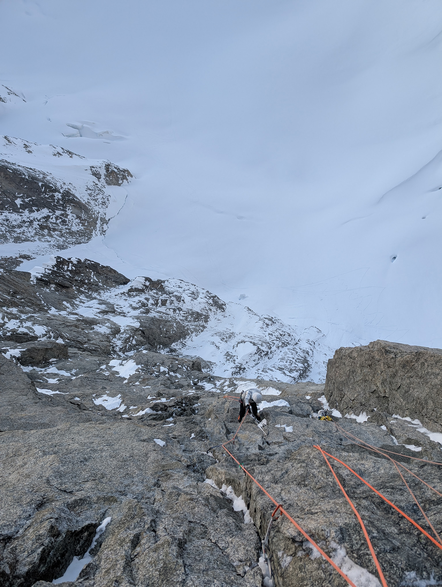 La muraille qui ferme le fond du glacier n’a manifestement pas livré toutes ses secrets. Je décide de laisser le matériel au pied de la paroi. Une autre ligne s’impose à moi.
