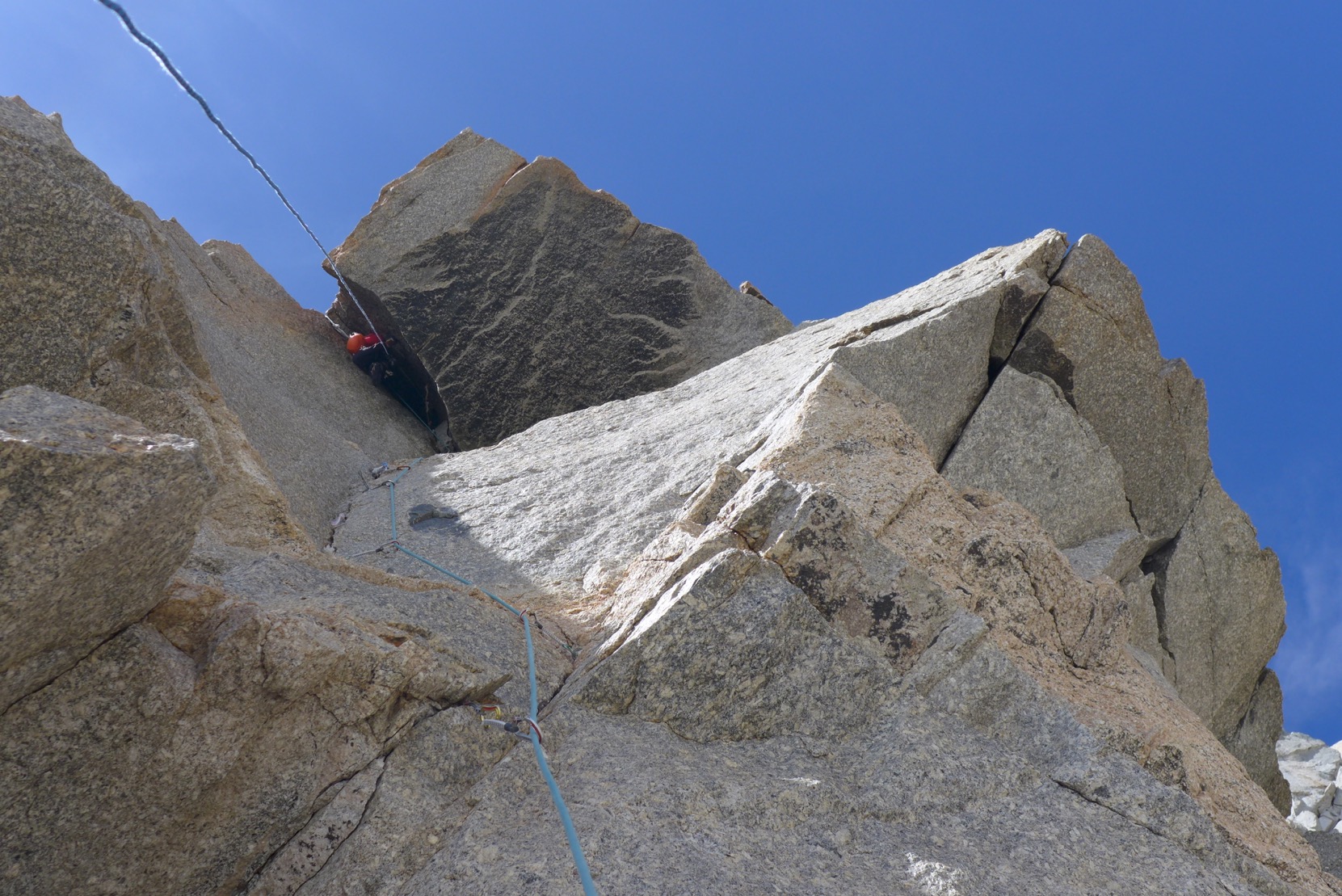 Le relais suivant, suspendu sur quatre pitons, nous permet de réverser l’escalade. C’est non sans un petit pincement au coeur que je me résous à partir en libre dans la fissure suivante. Protégée par de nombreux pitons et autre matériel coincé, l’escalade s’avère intéressante. L’arrivée sous le toit et l’entrée dans la cheminée suspendue constitue la cerise de ce beau dièdre. Il faut de même ôter le casque pour s’extirper de cette partie finale avant d’empoigner de beaux bacs oranges et rétablir au relais. A 4500 mètres d’altitude, cette sympathique gymnastique nous coupe le souffle et nous nous employons tous les deux pour jouer le jeu du libre.
