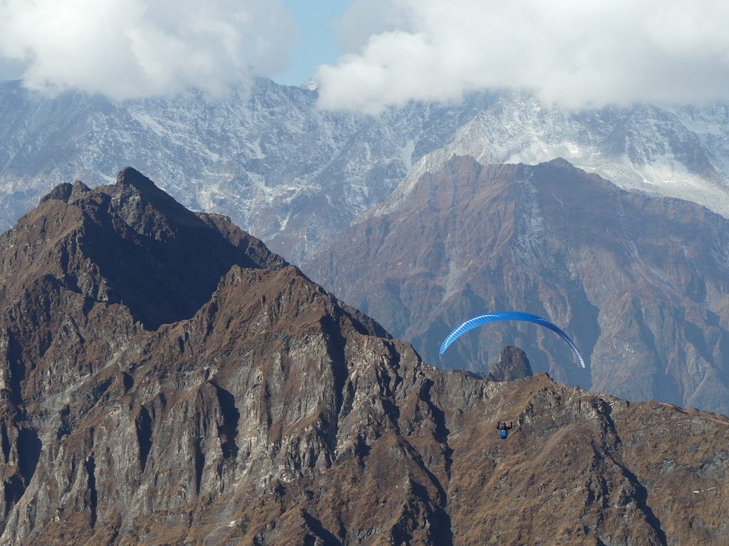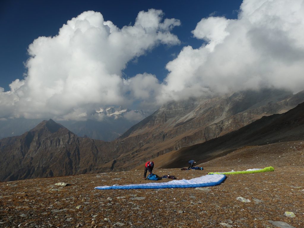 En France la saison n’a pas été optimale et notre entrainement à 4 s’est réduit au maximum. Entre les impératifs de chacun et une météo capricieuse nous avons fini par convenir que les 3 premières semaines à Bir seraient dédiées à ces « réglages ». Voler à 4 n’est pas simple surtout si ce vol est suivi d’une ascension. Nous voilà donc à Bir avec nos voiles habituelles qui seront ici nos véhicules de transport. Avec François nos « Zeolite » en S n’offrent que 85kg de PTV max (Poids Total Volant), pour faire simple il ne faut prendre que 10kg de matériel, eau, vivres. Clément est notre joker car son « Alpina 4 » un peu grande pour lui sera ici un atout. Quant à Cédric, il aura les mêmes contraintes de PTV que nous. Voilà déjà une première problématique. La seconde va apparaitre dès la deuxième semaine et sera la sur-fréquentation du site de Billing, notre zone de décollage. Il n’y a finalement que peu de sites accessibles pour décoller et l’engouement du parapente dans cette région est international. En gros c’est la queue au décollage, puis la guerre dans le thermique. Tu dois régulièrement éviter un pilote ingénu ou néophyte. Et quand l’objet du jour est de s’extraire à 4 pour transiter en montagne il est possible de perdre son calme. Heureusement l’ambiance est plus détendue qu’à Annecy donc ça passe encore. L’option sera alors de laisser passer la première vague. Mais cette solution ne fonctionne qu’au début car des nuages se forment rapidement et occupent le ciel juste au-dessus de Billing la zone de décollage. Et à ce moment-là l’ingénu c’est toi ! Car évidemment tu ne voles pas dans les nuages. Alors qu’elle est ta surprise quand, aux abords d’un nuage, surgit un ignorant joyeux (euphémisme d’imbécile heureux) que tu dois éviter. Mais tout cela fait partie de notre apprentissage de l’écosystème volant et comme nous étions correctement acclimatés à 4000m en France, nous partons sans hésiter vers la seconde phase du projet, la partie principale qui débute à Manali.