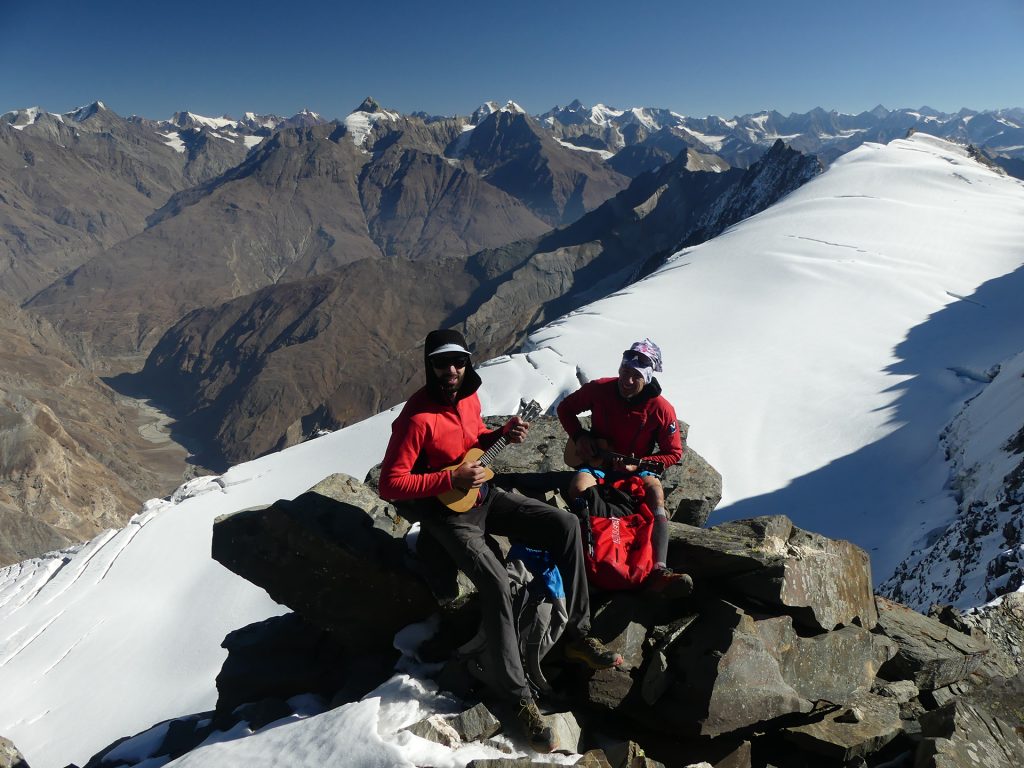 Un décollage fréquenté par les biplaceurs locaux est situé sur la route qui mène au col de Rohtang. Il permet de décoller à 3600m d’altitude. Au pied de l’Hanumam un autre site officiel est situé à Solang et utilise la télécabine pour prendre 450m de hauteur au-dessus du posé. Mais l’extraction est difficile et les cabines ne fonctionnent qu’à partir de 11h. Pour notre projet qu’est l’Hanuman Tibba le Rohtang pass semble être la meilleure option, car nous devons sortir haut (5200m environ) et tôt pour transiter vers une face E sur laquelle nous devons atteindre 5400m et se laisser glisser au pied de l’Hanuman. Pour compliquer la chose, lors des journées claires un fort vent catabatique nous barre le décollage et ne se calme qu’à 11h30. Nous parlons là d’une brise descendante mesurée à 100km/h à l’anémomètre. D’essais en tentatives les jours se sont égrainées inexorablement. Par deux fois 2 pilotes sur 4 auraient pu se jeter au pied l’Hanuman mais le manque de plafond rendait la prise de décision trop courte. Il faut préciser aussi que nous avions convenus d’un minimum de 3 pilotes sur 4 pour se poser. Cette décision préalable tenait au fait qu’en cas de blessure il est quasi impossible, seul, de transporter un blessé. Car sans le parapente rentrer du pied de l’Hanuman Tibba demande 2 jours de marche. Mais nous n’étions qu’à un fil de la réussite car ensuite l’ascension alpine semblait débonnaire et nous n’aurions pas hésité à charrier notre sac de 20kg jusqu’à Manali si toutefois le redécollage de l’Hanuman avortait. Enfin Nicolas notre routeur annonça que les 5 derniers jours allaient être stables. La prophétie se concrétisa par des thermiques culminant à seulement 4000m. Même les biplaceurs locaux nous confirmèrent que la saison 2024 allait se clore. Pour profiter de ses quelques jours de beau temps avant l’hiver nous avons donc abandonnés nos parapentes et nous avons grimpé au sommet du Shitidhar 5294m pour chanter nos louanges à Hanouman, le dieu singe capable de survoler l’himalaya. Les deux ukulélés ont retentis dans un décor de rêve !