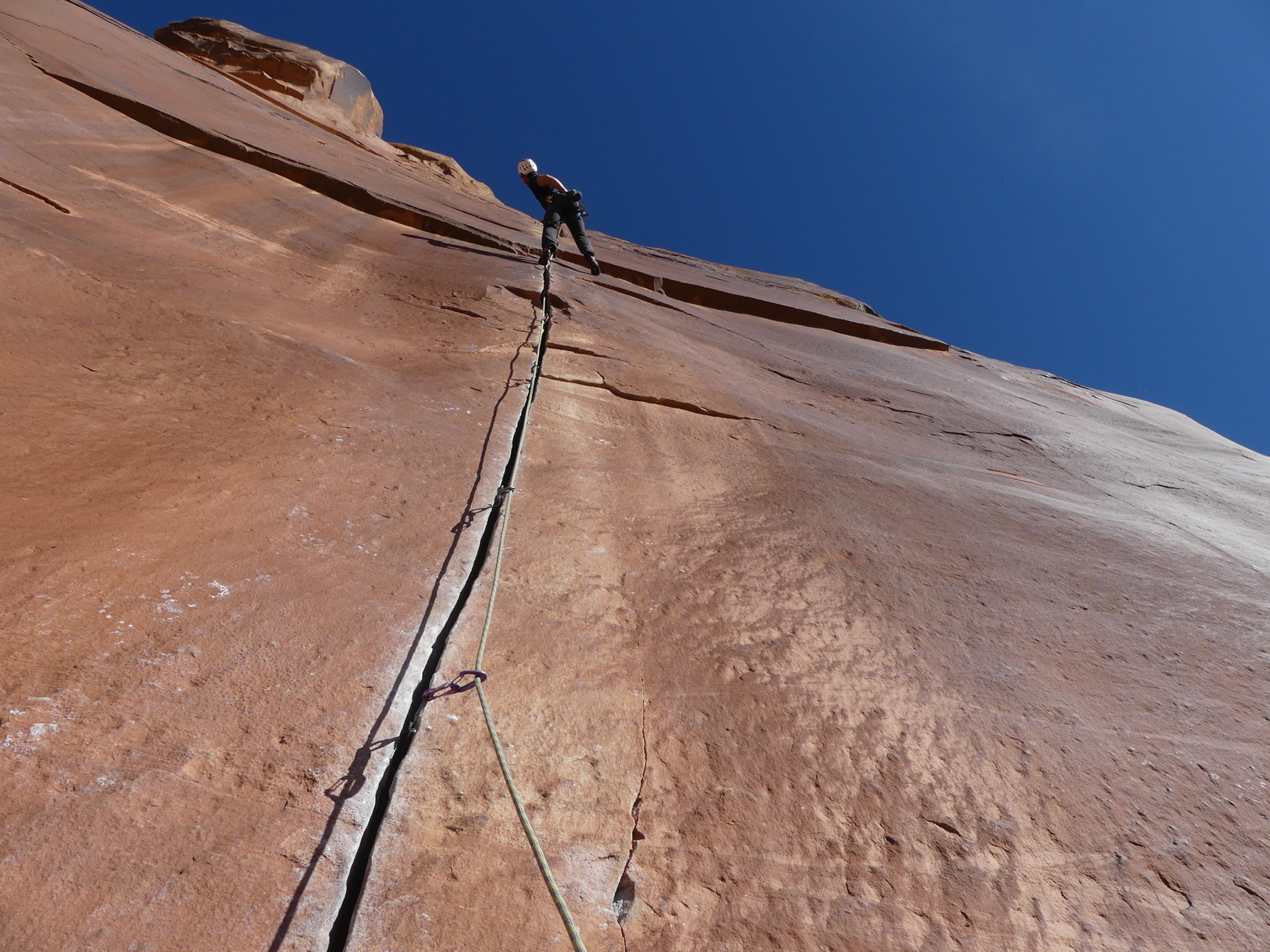 Point GPS Dragon’s nest : 38°43’35.17″N 109°17’48.52″W Prendre baudrier et matériel de remontée sur corde fixe (micro-traction + jumar) et un descendeur en cas de demi-tour. Corde de 50m en place (quasi vertical).