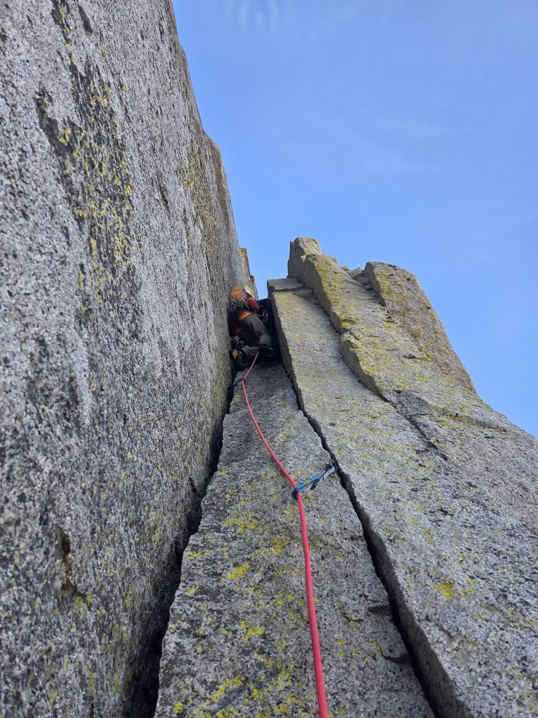 Nous découvrons ensuite la vie des big walls : gestion des cordes, montage du ledge et hissage. Ce dernier nous remet vite les pieds sur terre : les sacs sont lourds et le hissage demande beaucoup de temps et d’énergie. Heureusement, chacun a droit à son lot de longueurs « faciles », mais marquantes pour se réconforter : des cheminées ou offwidths où chaque centimètre gagné est une victoire. Une fois n’est pas coutume, je grimpe de nouveau au coucher du soleil, dans le magnifique Enduro Corner, et je laisse les trois longueurs nous séparant du long ledge à Konrad, qu’il gravie de nuit en artif. A 2h du matin nous en terminons, décidément aucune journée ne se terminera de jour, sauf la sortie le lendemain à midi après 3.5 jours.