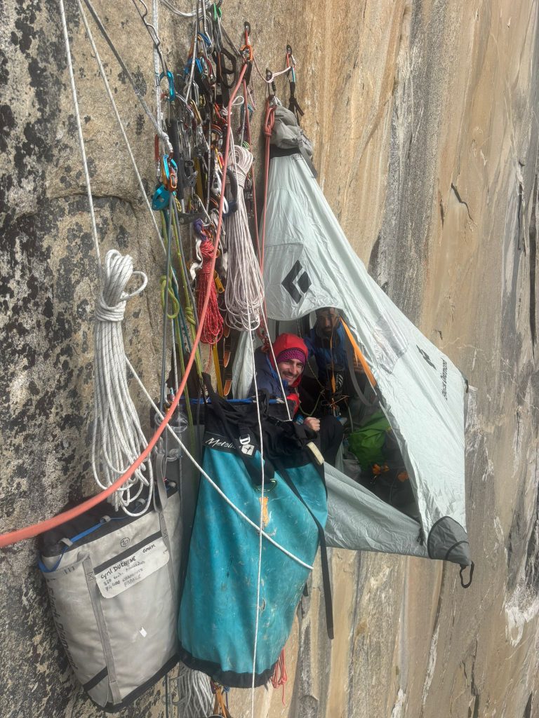 Sept jours sont initialement estimés. Les trois premiers se déroulent sans encombre, ou presque : Amaury fait les frais d’un petit vol de 25 m avant de repartir et d’enchaîner une longueur d’A4. Au quatrième jour, après une longueur d’A3 pour Clovis, le mauvais temps impose une journée de repos forcé dans le portaledge, probablement synonyme d’un jour supplémentaire dans le mur. Finalement, après deux autres longues journées, ils sortent au sommet le samedi 8 novembre, au début de la nuit : 6,8 jours d’engagement et ce crochet n’était pas aussi utile à priori.