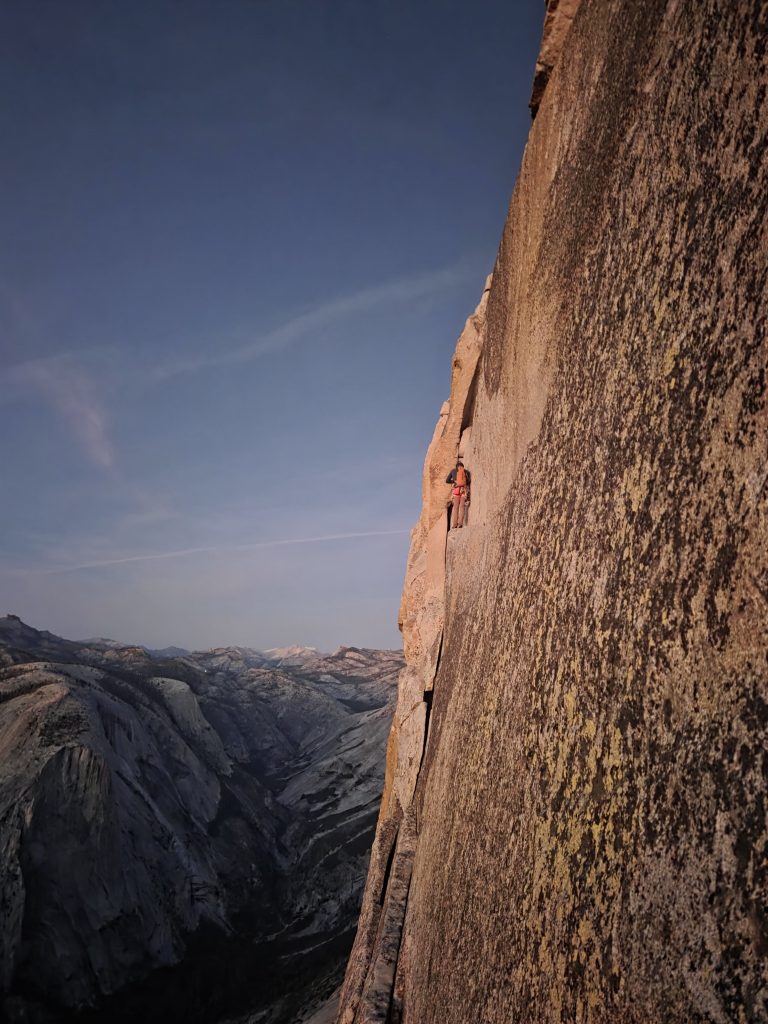 Bien adaptés au décalage horaire, Amaury et Clovis se lancent le défi de gravir le Half Dome par la Regular NW Route à la journée. Départ à 5 h du parking, les 800 m d’approche sont avalés en 1 h 30 pour attaquer la première longueur à l’aube et sortir de la dernière à 14 h, soit 7 h dans la voie… C’est express. Quelques jours plus tard, c’est à mon tour, avec Konrad, de m’y frotter. Initialement prévue avec une nuit dans la face, l’ascension est finalement envisagée à la journée, galvanisés par le retour de l’autre cordée. Pour nous, ce sera bivouac au pied et 14 h dans la voie, avec une sortie de nuit. C’est moins express, mais pas moins riche en expérience, et j’ai le plaisir de voir le soleil se coucher pendant ma traversée de la fameuse Thank God Ledge.