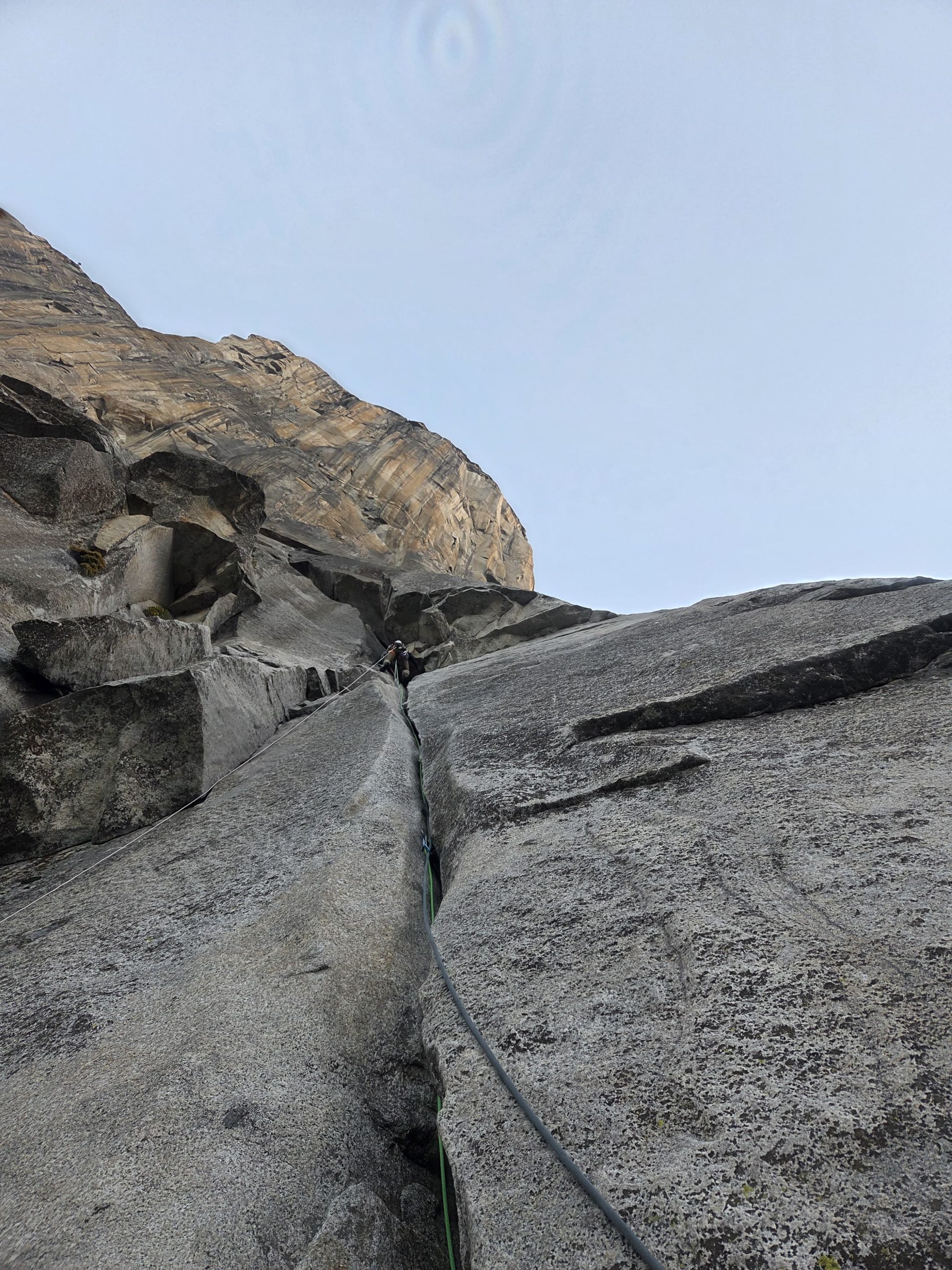Nous découvrons ensuite la vie des big walls : gestion des cordes, montage du ledge et hissage. Ce dernier nous remet vite les pieds sur terre : les sacs sont lourds et le hissage demande beaucoup de temps et d’énergie. Heureusement, chacun a droit à son lot de longueurs « faciles », mais marquantes pour se réconforter : des cheminées ou offwidths où chaque centimètre gagné est une victoire. Une fois n’est pas coutume, je grimpe de nouveau au coucher du soleil, dans le magnifique Enduro Corner, et je laisse les trois longueurs nous séparant du long ledge à Konrad, qu’il gravie de nuit en artif. A 2h du matin nous en terminons, décidément aucune journée ne se terminera de jour, sauf la sortie le lendemain à midi après 3.5 jours.