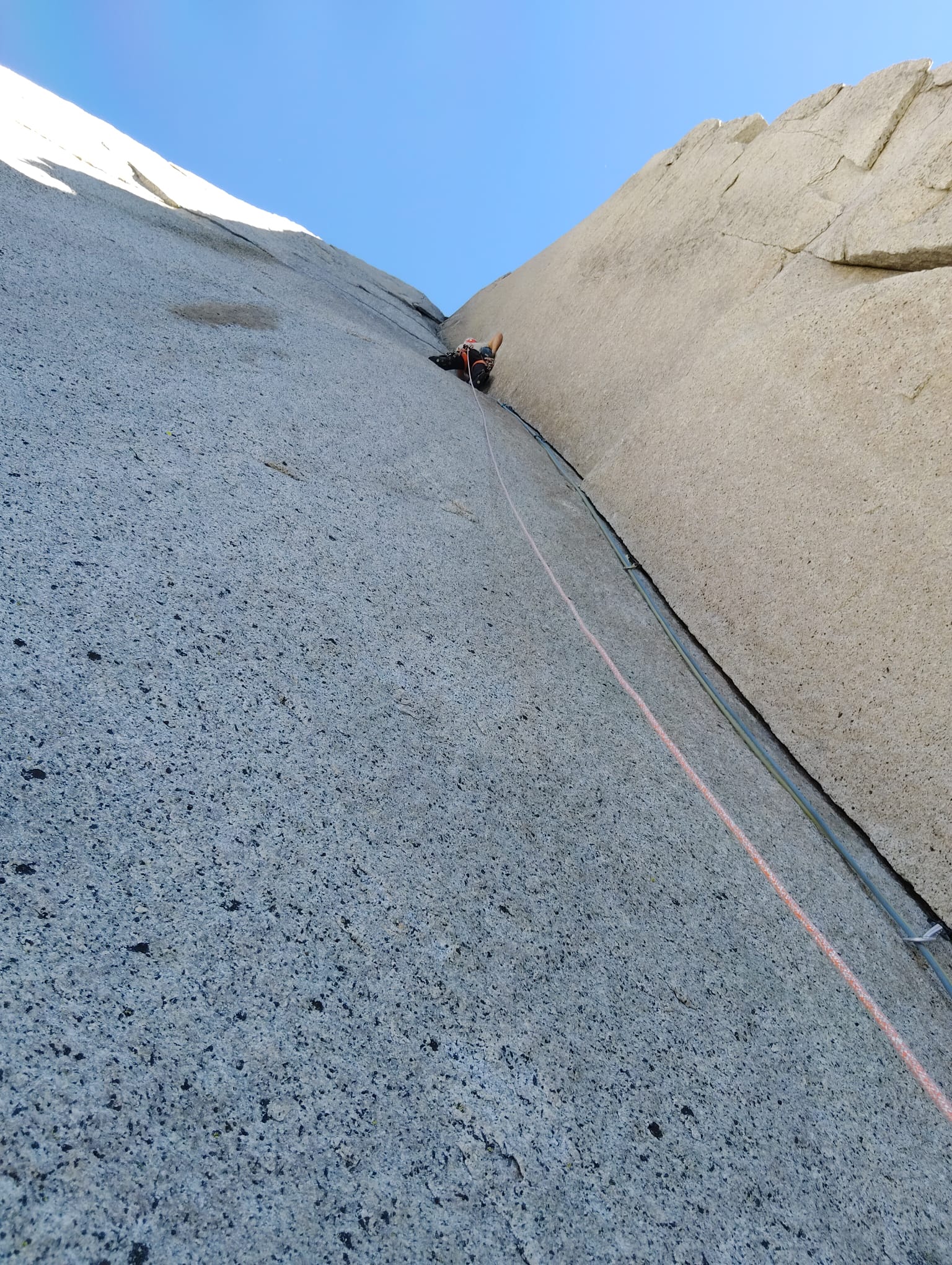 Léo et Jordi choisissent le libre dans Pre-Muir Wall. Plus expérimentés, ils savent qu’il faut être légers pour aller vite. Ils déposent donc de l’eau au sommet et emportent le strict nécessaire, ce qui impose de grimper rapidement, sans trop de marge à l’erreur. Nous les croisons à Heart Ledge le premier jour, et j’apprends que Jordi n’a pas enchaîné l’une des longueurs. Il consacre alors toute son énergie et sa bonne humeur à la réussite de Léo, sur qui reposent les derniers espoirs, mais qui se montre en forme olympique. Comme à son habitude depuis le début du séjour, il engloutit les longueurs aussi vite que les bagels au houmous. C’est sous une chaleur accablante qu’il enchainera la longueur Stem en 5.13c pour laquelle il s’était préparé. Le dernier jour, ils dépassent Amity Warme, présente dans le mur depuis plusieurs jours déjà. Léo profite des protections en place pour parcourir directement la dernière difficulté et ils laissent alors leurs vivres restants à Amity pour filer vers le sommet.